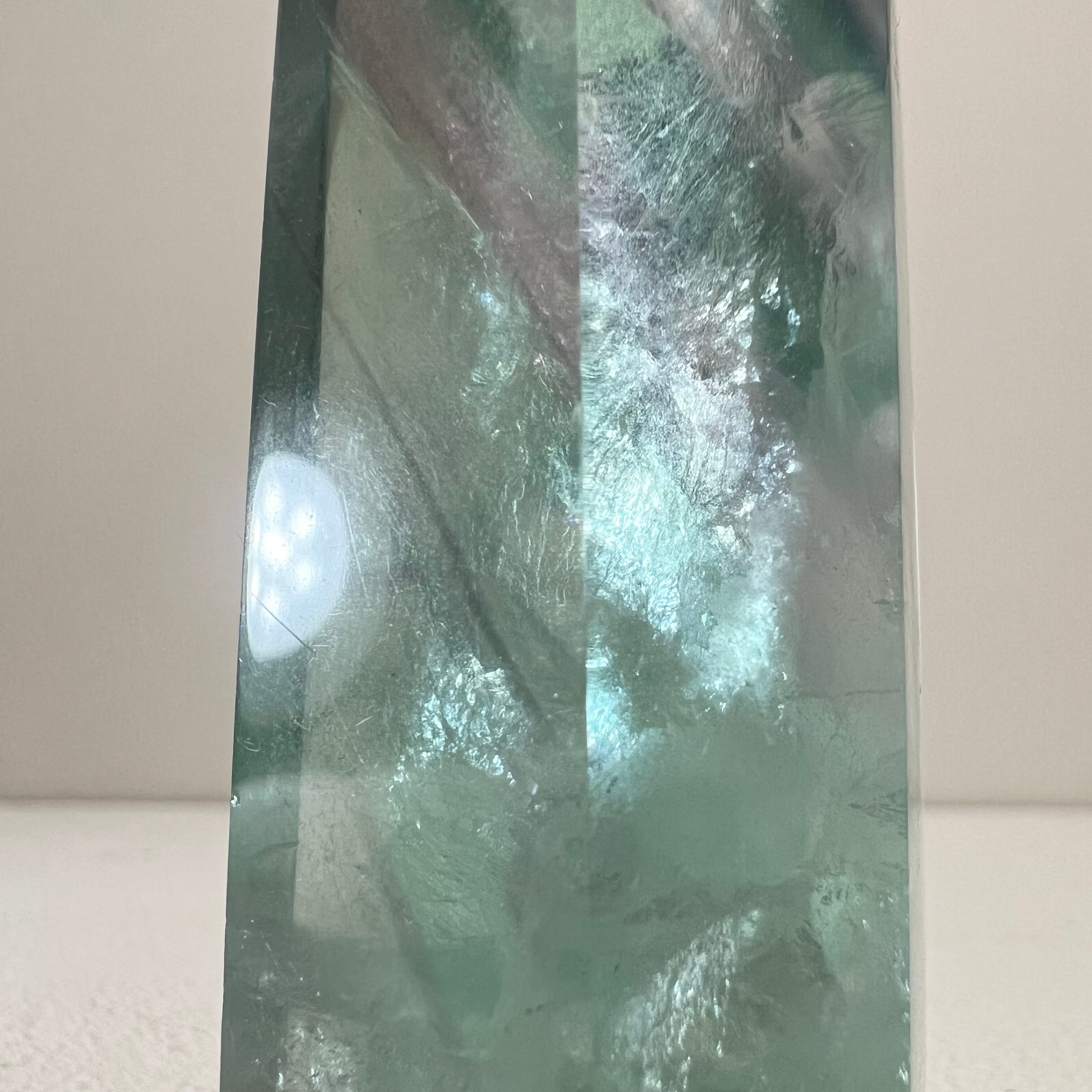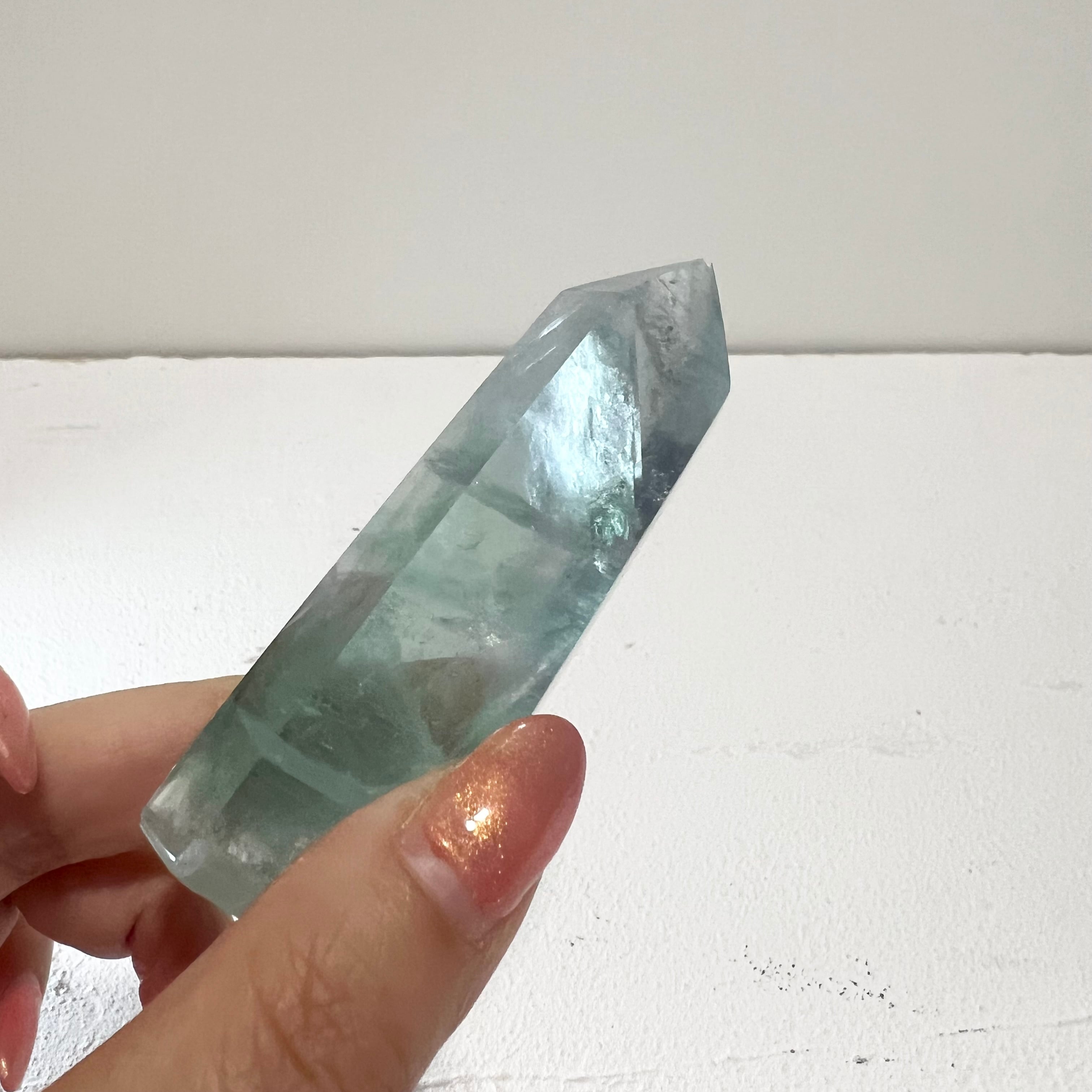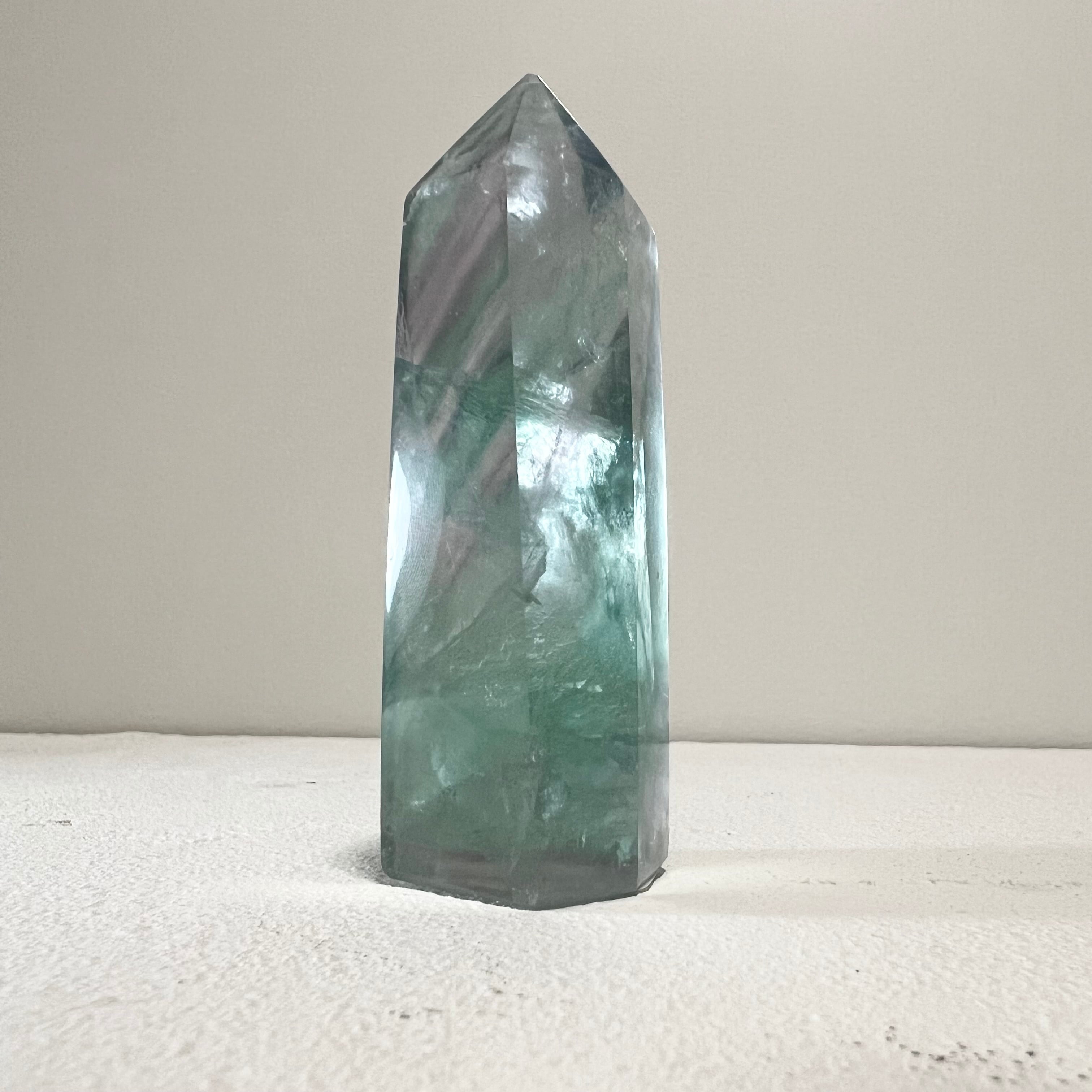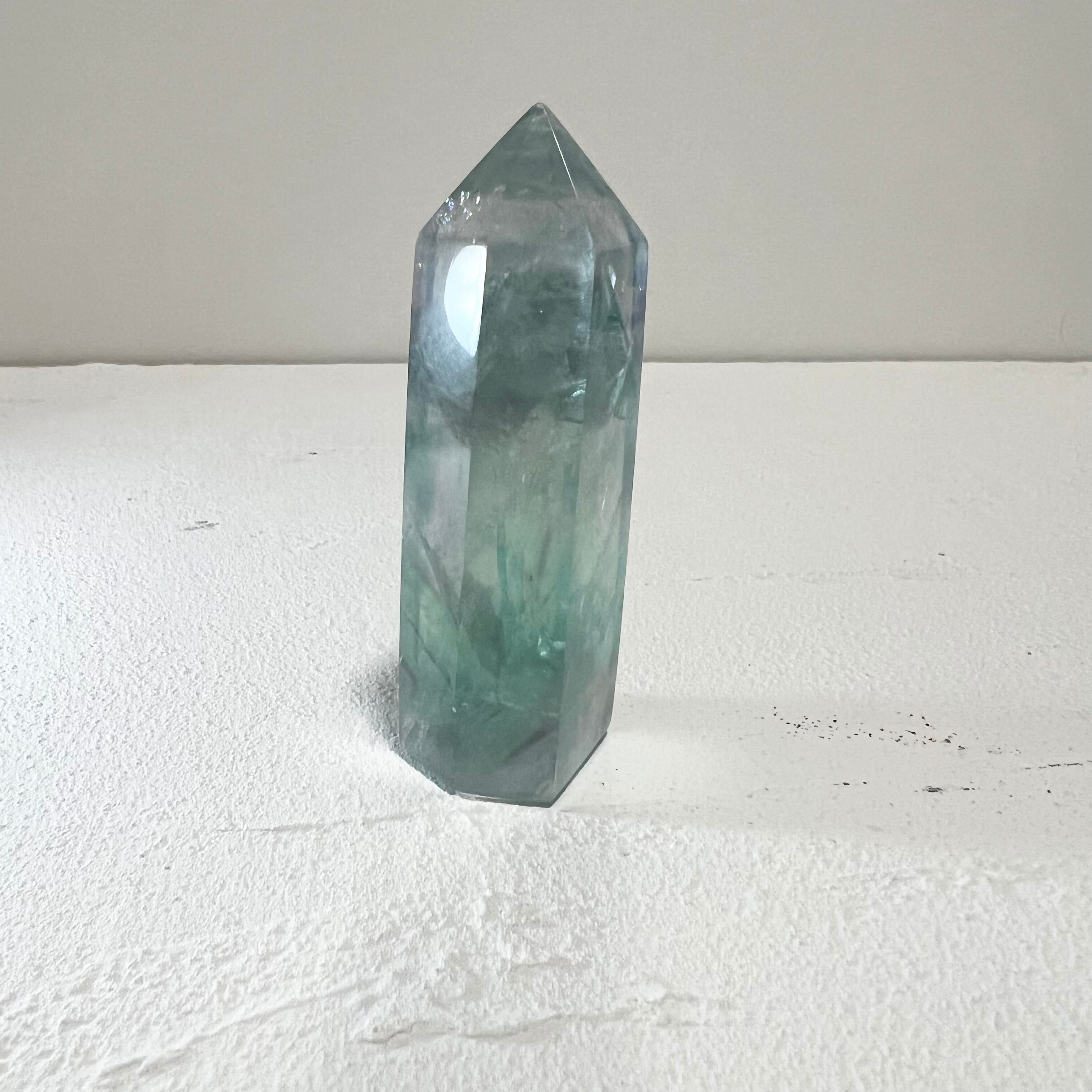 深いグリーンと淡いパープルが溶け合う、透明感の美しいフローライトです。光を透かすと内部の層状構造が浮かび上がり、見る角度によって表情が変化します。研磨された六角柱ポイント形状で、空間に凛とした存在感を与える一点です。✨