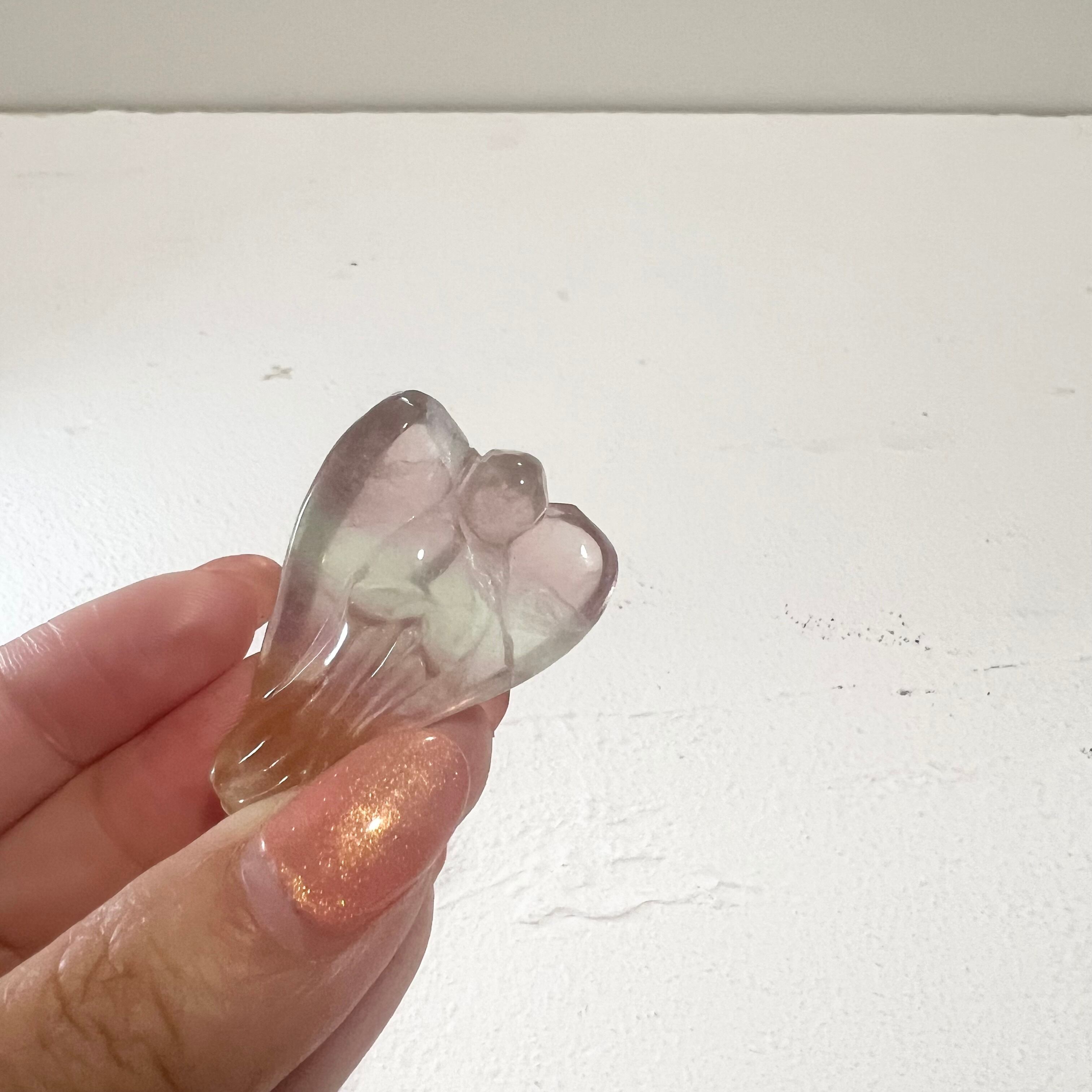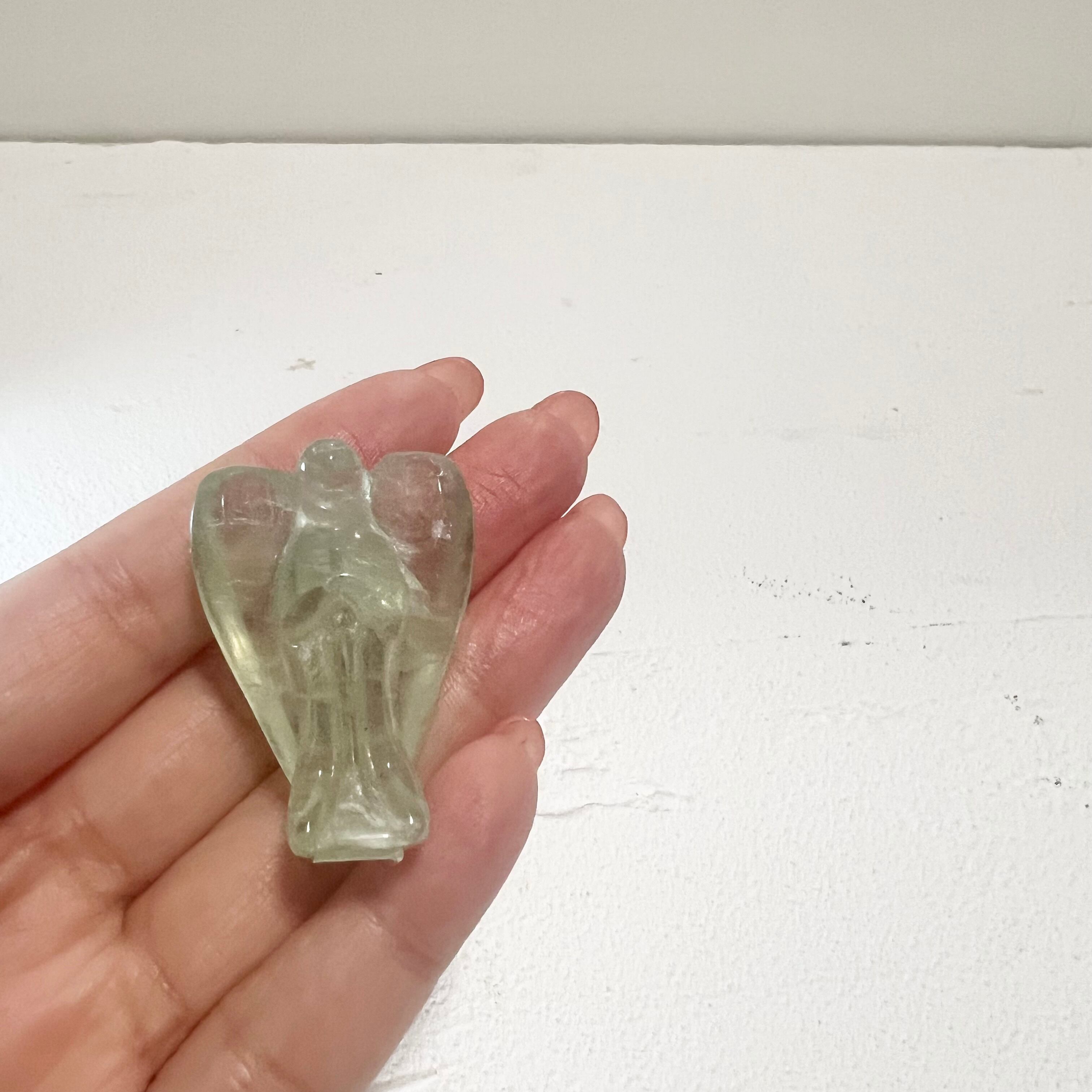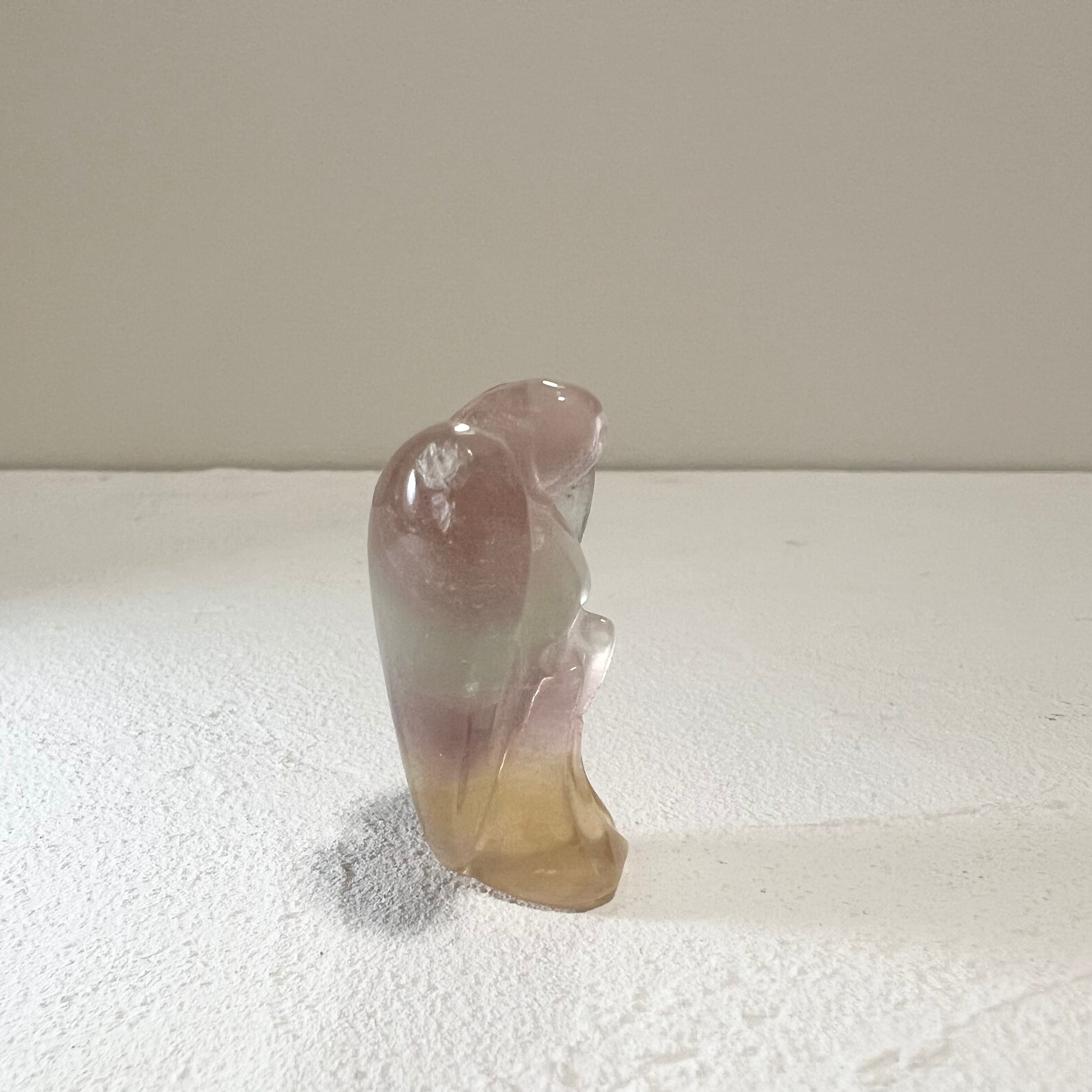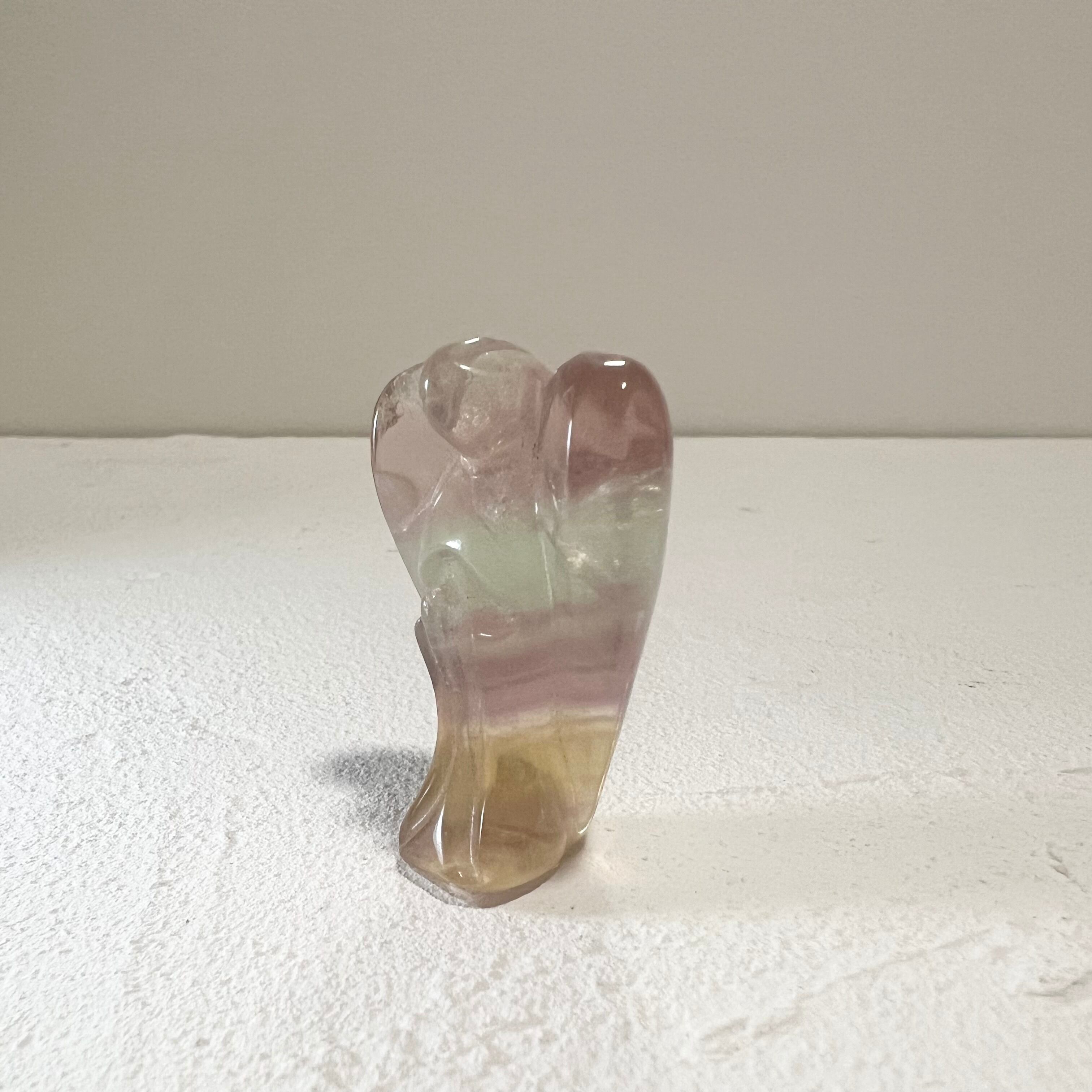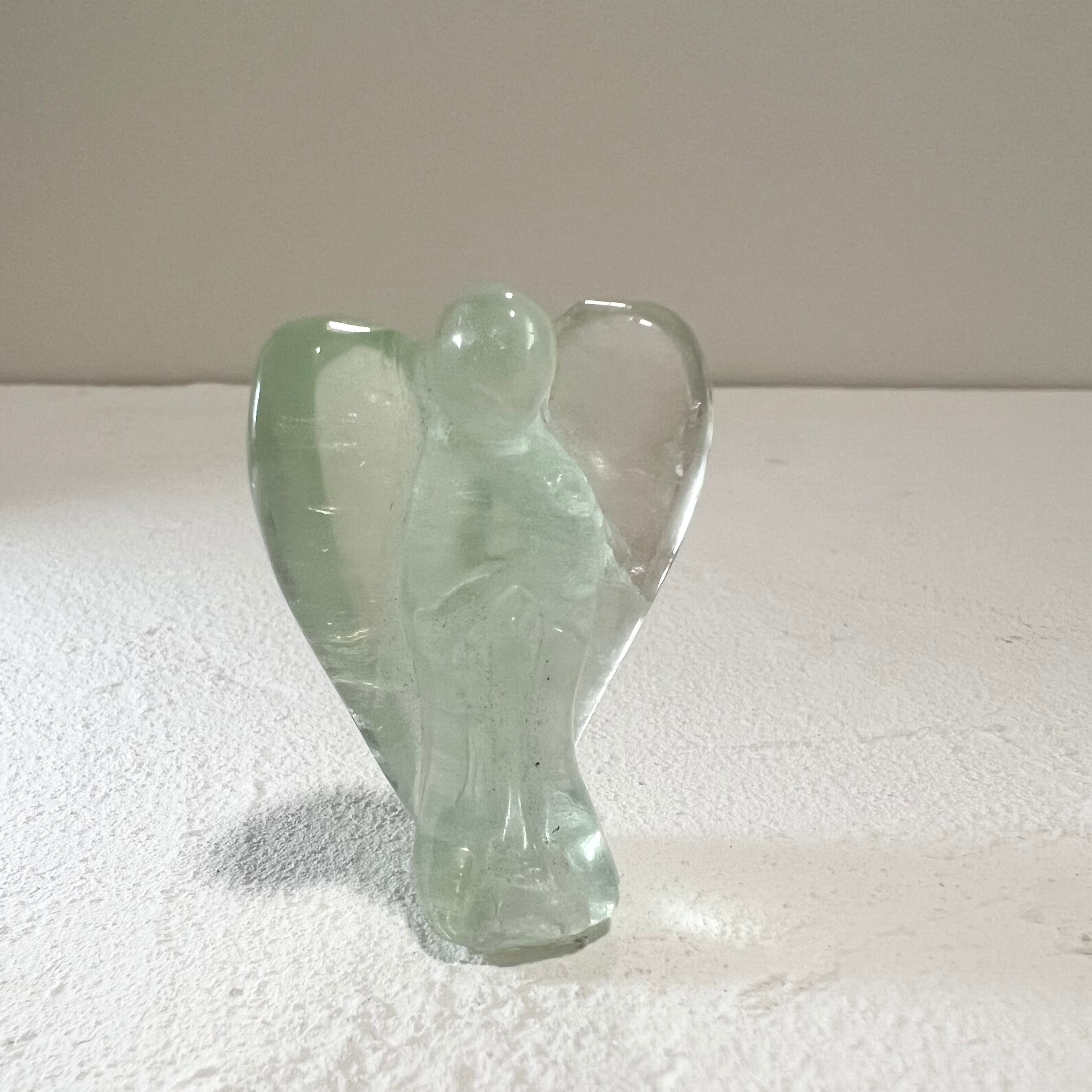 透明感のあるフローライトを丁寧に彫刻した、やさしい表情のエンジェル置物です。