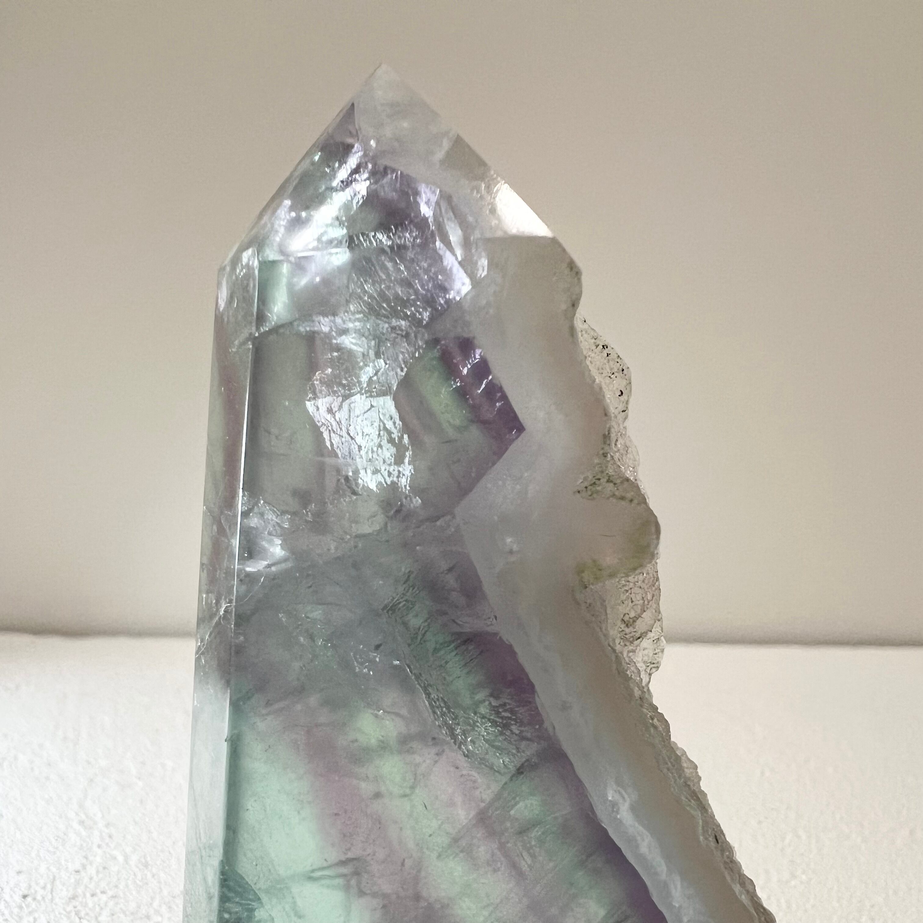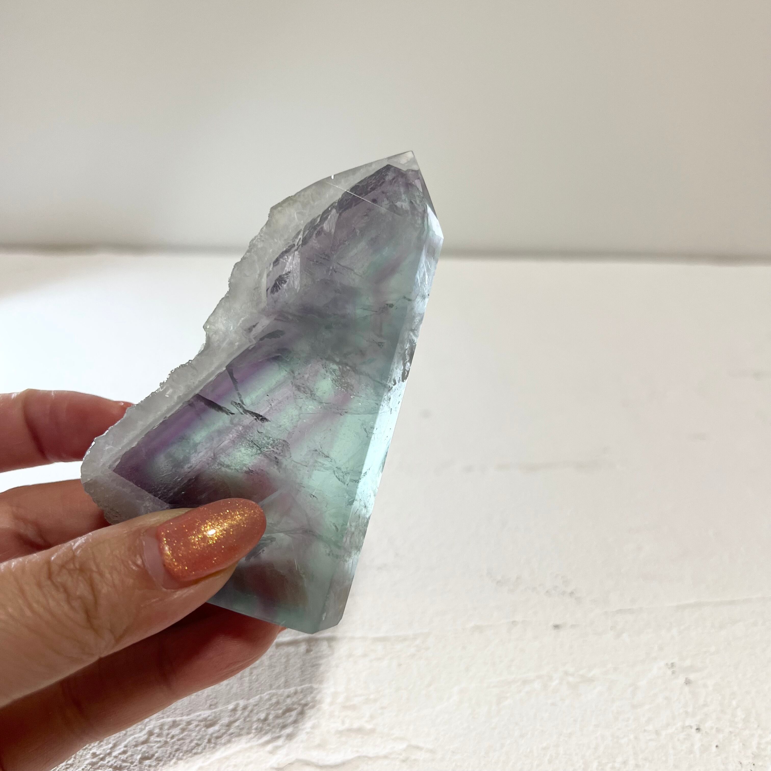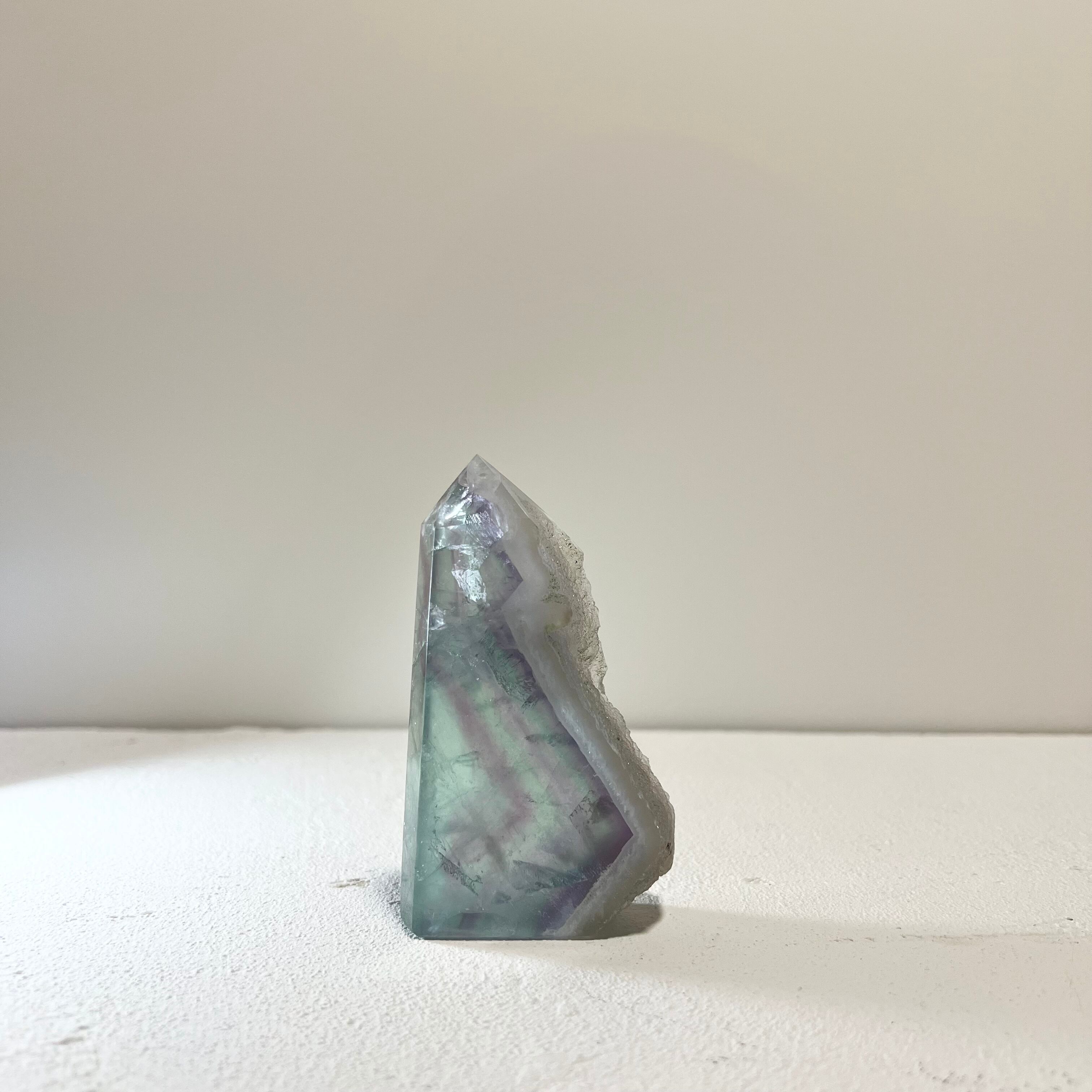 幻想的なグリーンとパープルのグラデーションが美しい、天然フローライトのポイントです。