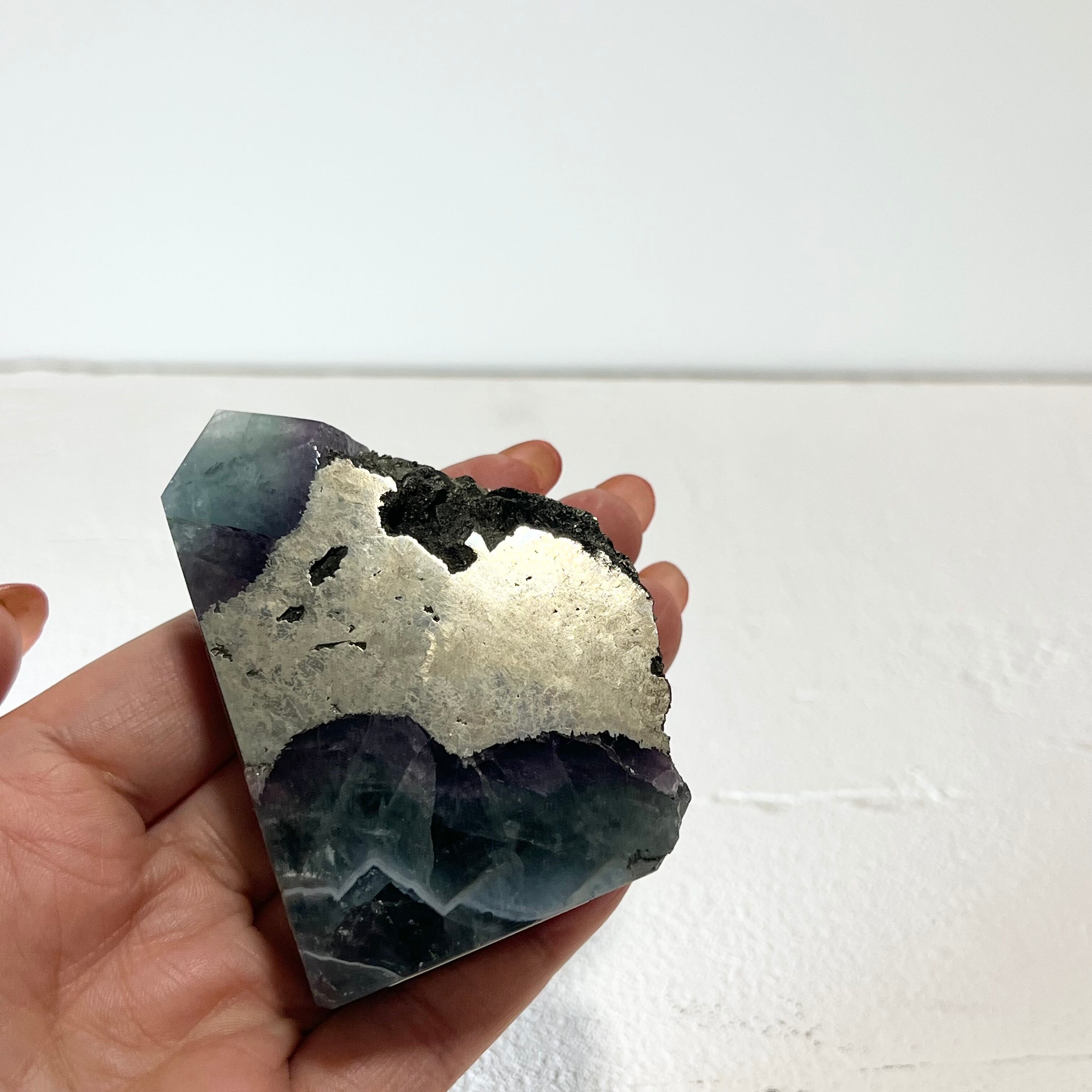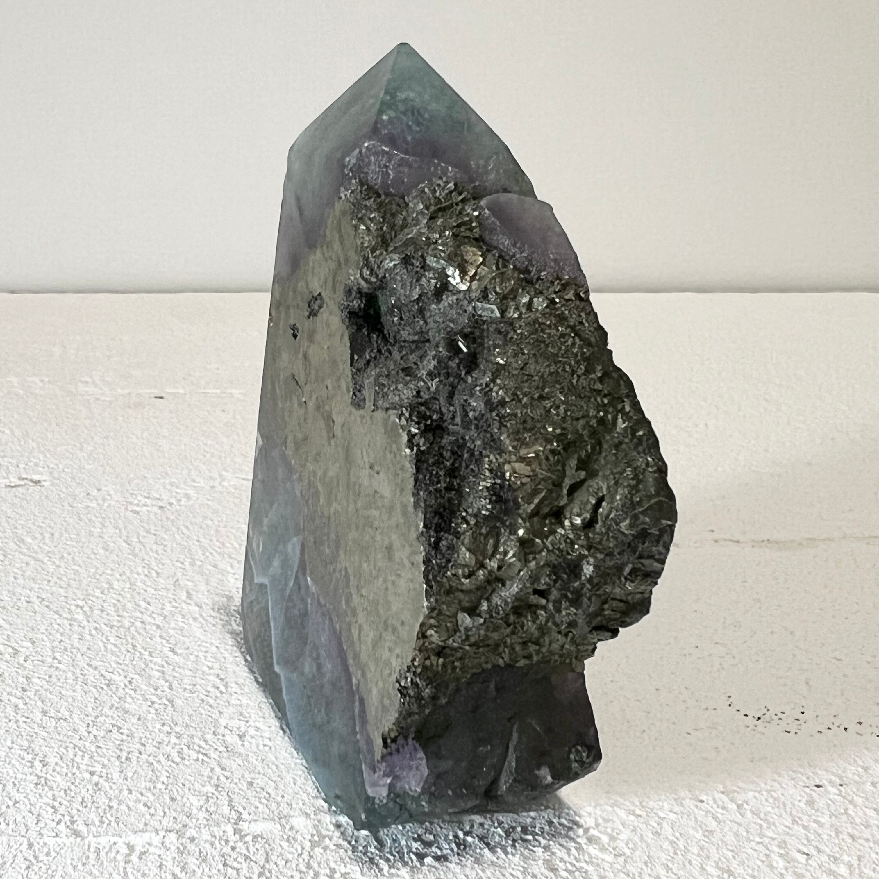 側面にはメタリックな輝きを放つパイライトが母岩状に付着しており、フローライトの透明感とのコントラストが魅力的です。人工的な加工ではなく、自然のままの境界線が残されているため、鉱物標本としての価値も高い一点です。